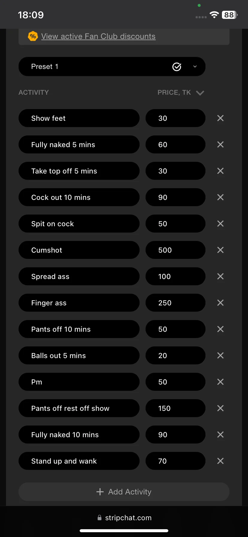 Ejakulacja, Anal, Sprośne słówka, Palcówka, Masturbacja, Zabawki, Prysznic, Klapsy, Twerking, Zabawki analne, Głębokie gardło, Striptiz